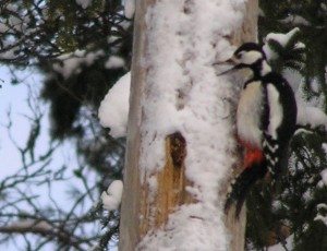 Keikyäläinen käpytikka näytti tammikuisena lauantaina, mikä käy tikalle palanpainikkeeksi pakkaspäivän aterialla. Tikka takoi lajilleen ominaiseen tapaan nokallaan auki suomuja männynkävystä, jonka se oli asetellut paikoilleen sähköpylvääseen kolotuun rakoon.