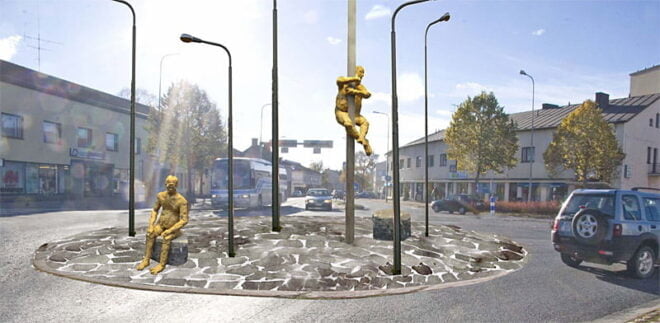 Taitelijat kuvailevat kaupungille osoittamassaan ehdotuksessa taideteosta seuraavasti: “Ehdotuksemme Huittisten Miljoonaristeykseen pitää sisällään lievästi kumpumaisen kivetyn liikenneympyrän, kaksi hieman luonnollista kokoa suurempaa ihmishahmoista veistosta sekä niitä ja liikenneympyrää valaisevat katulamput. Toinen hahmoista, vanhempi, istuu ja ihmettelee, kun taas nuorempi veijari on jättänyt istuimensa ja voimansa tunnossa kiivennyt valo-tolppaan katsomaan kenties tulevaisuuteen. Tolppaan kavunnut saa myös katsekontaktin linja-autossa matkaaviin. Mahdollisuuksien mukaan ympäröivää valaistusta voisi vähentää niin, että pimeänä aikana liikenneympyrän valot loistaisivat ympäristöään näkyvämpinä.”