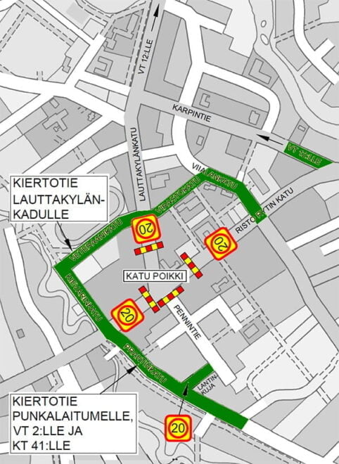 Risto Rytin kadun Punkalaitumelta tuleva ajosuuntaa katkaistaan liikenteeltä viikon
