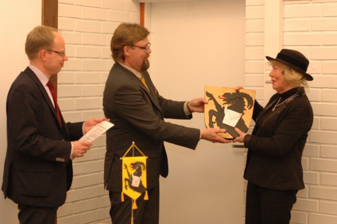 Kiikoisten Kotiseutuyhdistyksen puheenjohtaja Birgit P. Jaakola otti vastaan Kiikoisten kunnan vaakunan valtuuston puheenjohtaja Matti Huhdanmäeltä. Kunnanjohtaja Tapio Rautava seuraa tilannetta. Jaakola totesi, että vakuuna on vaalimisen arvoinen.