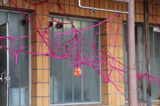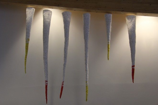 Torinkengän näyteikkunalla roikkuu Reetta Partasen taidetta.