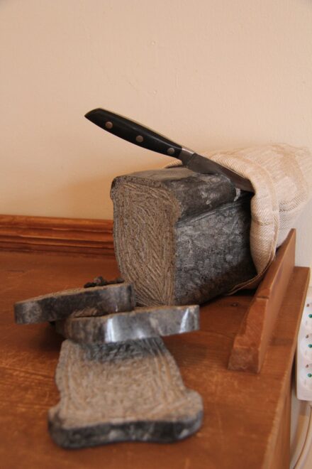 Kahvila Helmessä on esillä Toni S. Halosen "Niin kivinen on leipämme" -teos.