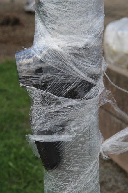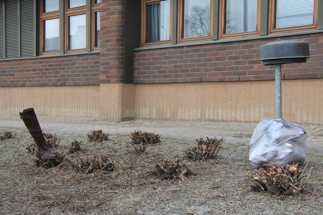 Muovipusseista valmistettu hahmo pitää majapaikkaa meijerillä.