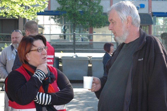 Uransa Vammalan aluesairaalan synnytysosastolla tehnyt Eija-Liisa Suominen nauttii Tehyn ammattiosaston tarjoamaa kahvia Vammalan torilla lauantaina 25. toukokuuta. Hän ei ole ainoa, sillä sairaalan synnytysosaston lakkautusuhka riepoo kaupunkilaisia.