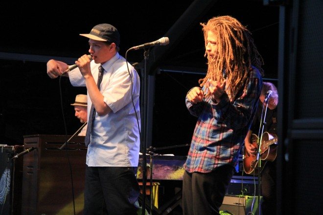 Elokuu-yhtyeen Nopsajalka (vasemmalla) ja Juno pitivät tunnelman katossa.Elokuu sai yleisön mukaan hyvään meininkiinsä.Yleisö tanssi, nauroi ja lauloi Elokuun mukana keikan aikana.Lauantain pääesiintyjänä toimi Jukka Poika.Jukka Pojan musiikki upposi festariyleisöön.