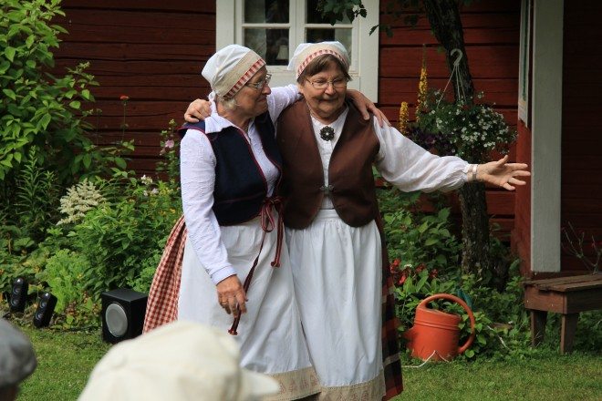 Airi Viitanen (oikealla) emännöi Peräniityn torpan kesäjuhlia ja osallistui Sammun Känkin tanssiesityksiin.