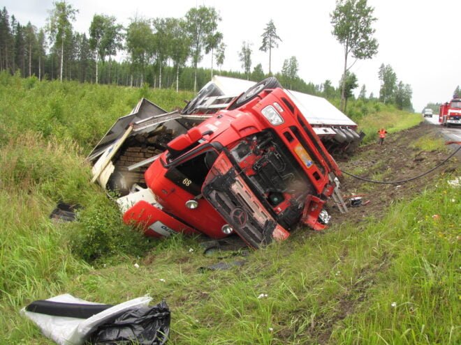 Raskaassa puutavaralastissa ollut rekka suistui ojaan Huittisissa tiistaina puolen päivän jälkeen. Tapahtumapaikka on Valtatie 2:lla noin viisi kilometriä Huittisista Helsingin suuntaan. Onnettomuuden syy on toistaiseksi epäselvä. Tapahtumapaikalla tehdyn arvion mukaan kuljettaja loukkaantui ulosajossa lievästi. Hänet kuljetettiin saamaan hoitoa Satakunnan keskussairaalaan. Rekka vaurioitui onnettomuudessa tuntuvasti. Onnettomuuspaikan raivaustyöt ovat käynnissä. Toinen ajokaista on suljettu liikenteeltä. Rekan nostotyöt tullaan suorittamaan illan aikana, jolloin molemmat ajokaistat ovat pois käytöstä.
