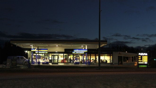On se kummallista ettei tähän kylään jää kuin yksi huoltoasema. Ei kaikkea saa kylmäasemalta. Miehet taitaa osata hakea muista liikkeistä öljyt ja polttimot, mutta entäs naiset. Autoa ei ainakaan tarvi koko talvena pestä kun kotona ei voi ja ruuhkaa voi olla jäljelle jääneessä. Harmi. Sillan toisella puolella olis tilaa…