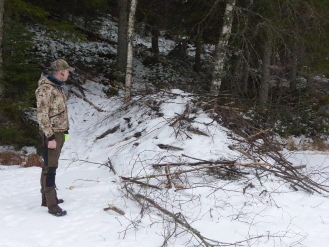 ”Tämä on selvästi asuttu. Ja ympäristössä on tyypillistä jälkeä, jota majavat tekevät. Puita on kaadettu, erityisesti näitä lehtipuita, joiden kuoret ovat majavien herkkua”, toteaa Mikko Rapeli Levon Metsästysseurasta. Hän on seuran majavavastaava, hoitaa lupa-asiat ja laskee alueen majavakantaa. ”Täällä on euroopanmajavia eli Suomen alkuperäisasukkaita. Vieraslajia, kanadanmajavaa ei ole. Euroopanmajavia on muutamia kymmeniä.”