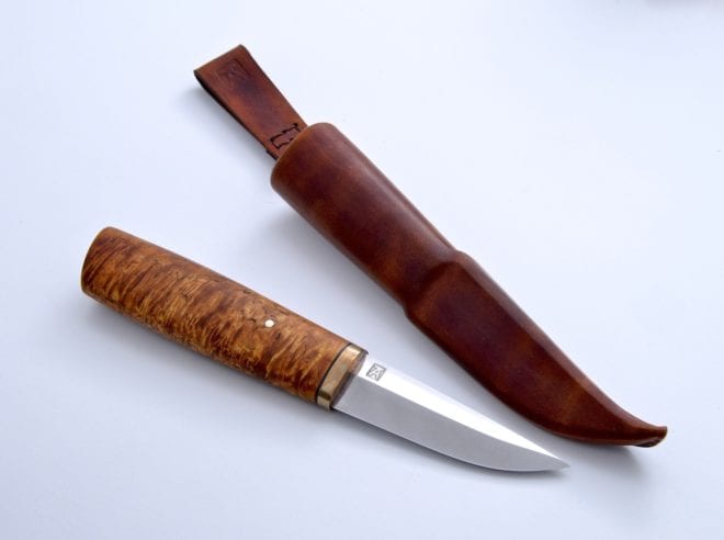 ”Kahva on visakoivua ja tuppi kasviparkittua naudannahkaa. Nimeä puukolla ei ole.”