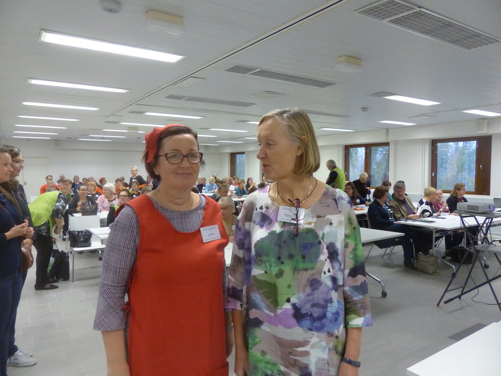 Sastamalan Oppaiden puheenjohtaja Eija Vaateri (vas.) ja Suomen Opasliiton puheenjohtaja Hanna-Leena Laihonen valmistautuvat koulutuspäiviin.