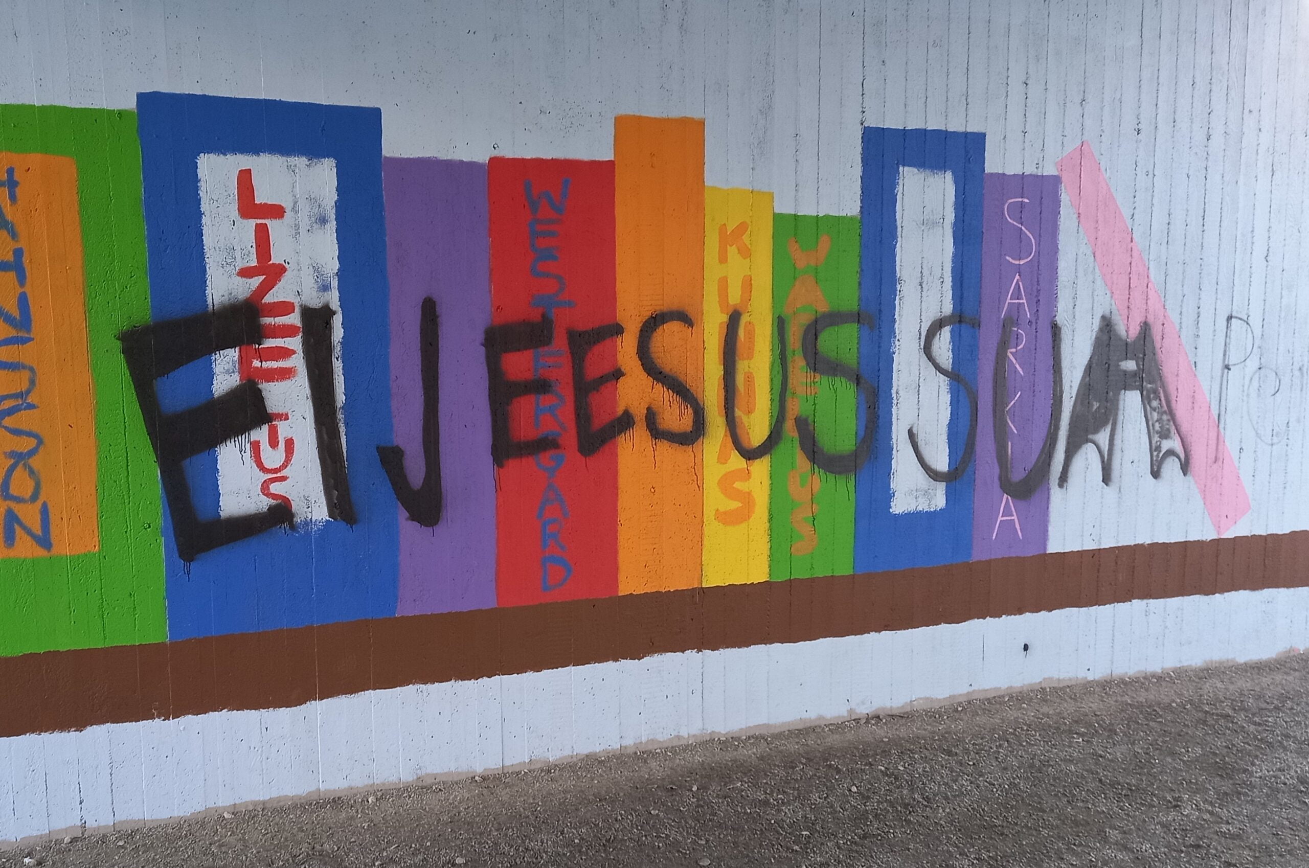 Hei, Töhrijä! Tässä sinulle julkisuutta. Sitähän lienet tavoitellut. Ikävä vaan, että samalla tuhosit seinäpiirroksen, joka todella sopi tähän Vammaskosken sillan alikäytävään ja Kirjakaupunki-imagoomme. Jos käytössäsi on myös pienempi fontti, ehdotan – jos sinussa on nimittäin yhtään miestä – että kirjoitat Toimarin väelle reilun anteeksipyyntöviestin. Osoite löytyy Sotesin sivuilta. Ei oma paha mieli katoa sillä, että aiheuttaa sitä toisillekin.