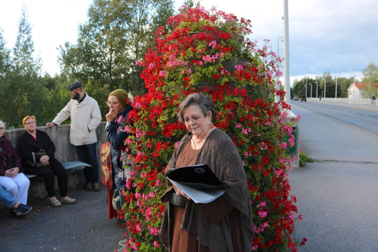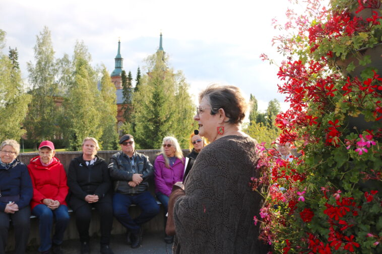Nykyään Vammaskosken sillalla on levennys penkkeineen ja näyttävine kukkaistutuksineen. Siihen oli hyvä pysähtyä kuuntelemaan Outi Metson kertomaa sillan historiasta.
