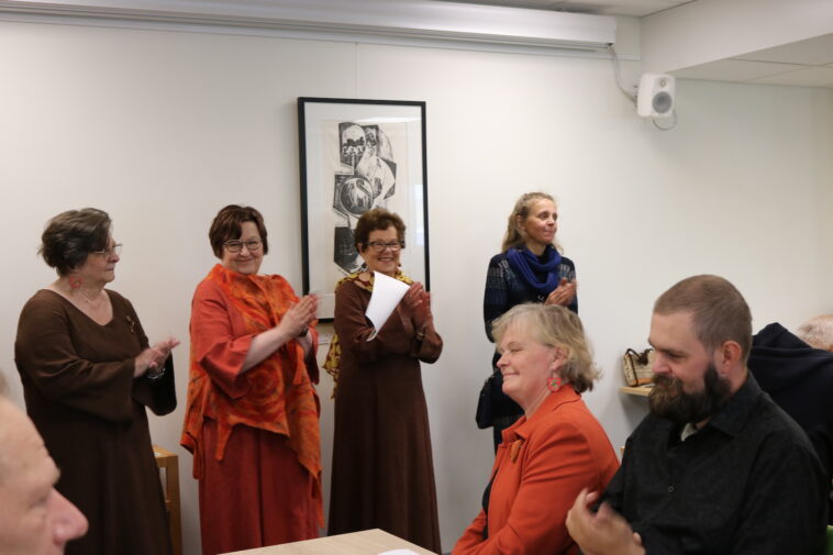 Tyrvään seudun Kotiseutuyhdistyksen siltajuhla jatkui siltakävelyn jälkeen “meijerillä” ohjelman ja herkkujen kera. Kuvassa yhdistysaktiivit Outi Metso, Tuija-Maija Pullinen, Maiju Vuorenoja ja Outileena Uotila. Istumassa illasta nauttineet Päivi Ketola ja poikansa Juha Ketola, paikallishistorian harrastajia molemmat. Vammaskosken sillan vaiheet olivat molemmille entuudestaan tuttuja, mutta illasta tarttui mukaan uutta tietoa Karkun alueen silloista.