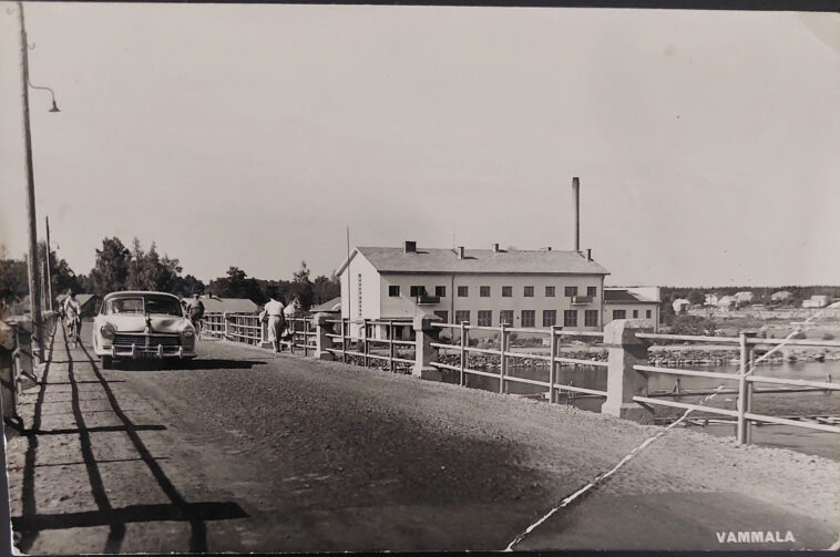 Vammaskosken siltaa 1950-luvulla. Kuvassa näkyvä meijerirakennus on valmistunut 1952 ja siltaremontti vuonna 1958. Kuva ajoittuu näiden vuosien välille. Kuva: Outi Metson arkisto.