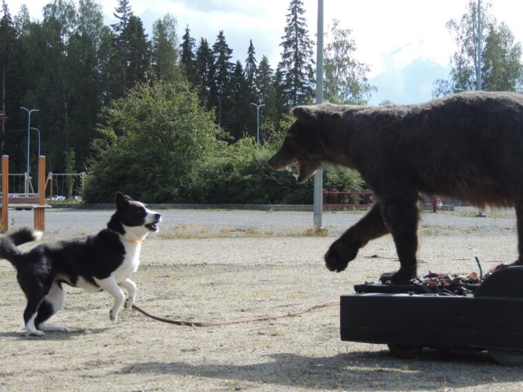Seuraava koira olikin jackrussellin terrieri. Testieläimenä oli ilves. Koira teki heti eläimelle selväksi, kuka käskee. Väitänkin, että oikea ilves olisi häipynyt maisemaan russeli perässään. Koiralla riitti energiaa, poikkesi jopa Askon suojaverhon takana vähän katsomassa karhuakin. Olen kuullut juttua, että suomalaisilla russeleilla ei enää olisi riistaverta. Se tieto ei ainakaan tämän koiran kohdalla pitänyt paikkaansa.
