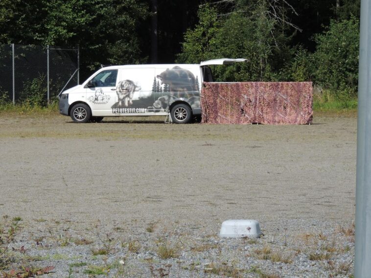 Päivä oli mukavan viileä koiria ajatellen. Testipaikalla pitää olla tuntia ennen omaa vuoroa, niin oli hyvä, kun autot eivät lämminneet saunaksi. Muut koirat kuin testattavat on pidettävä poissa näkyvistä testin ajan.
