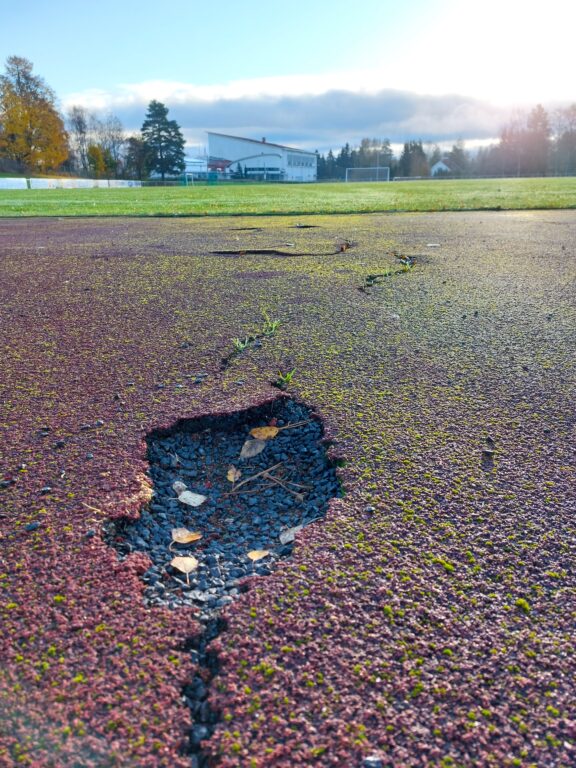 Sammal on kentän murheista pienimpiä. Pinnoitteet ovat käyttöikänsä päässä täälläkin. Kurjimmalta tilanne näyttää silmämääräisesti tarkasteltuna keihäspaikalla. Kentän pinta on halkeillut ja repeillyt ja siinä on paikoin isojakin koloja.