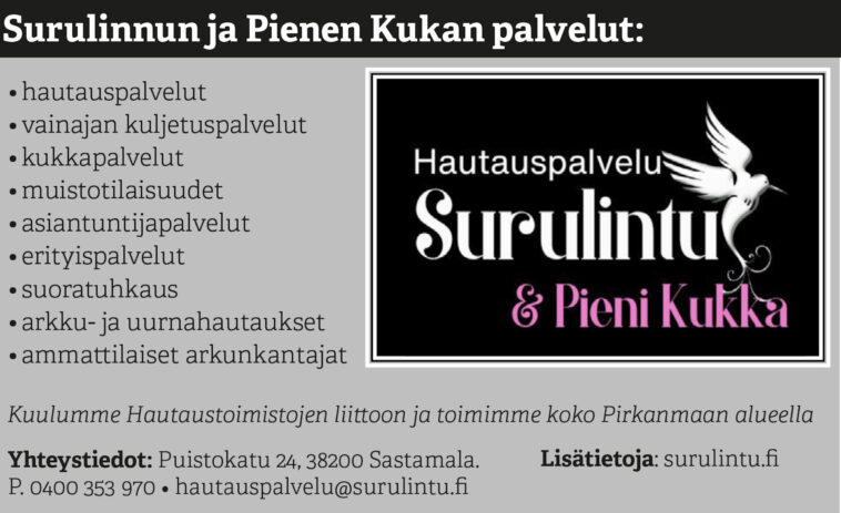 ”Olemme itse kokeneet, miten raskaalta hautajaisjärjestelyt voivat tuntua silloin, kun olisi tärkeintä saada vain keskittyä surutyöhön ja muistojen vaalimiseen. Tältä pohjalta syntyi ajatus perustaa yritys, joka ei ole vain hautauspalvelu, vaan myös tukena ja apuna omaisille silloin, kun sitä eniten tarvitaan”, taustoittaa hautauspalvelu Surulinnun omistaja ja toimitusjohtaja Sanna Syyskallio.