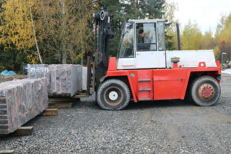 Massiivisten kivilohkareiden liikutteluun tarvitaan järeää kalustoa, kun jopa kymmenentuhatta kiloa painavia järkäleitä kuljetetaan pihalta työstettäväksi tuotantotiloina toimivaan halliin. Suurella trukilla kookkaita kiviä pystyy kuljettamaan ketterästi.