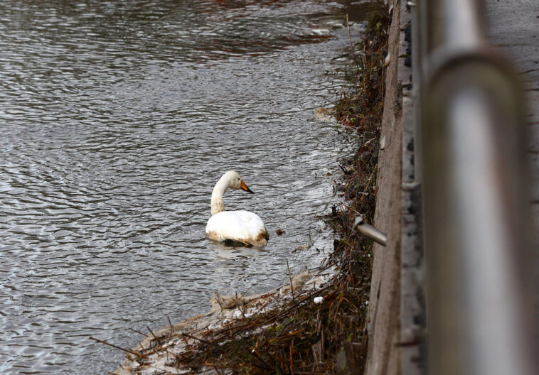 Lintu ui heti hieman kauemmaksi, kun utelias ihminen tuli muutaman metrin päähän padon yläpuolelle katsomaan. Kauempana rannalla makasi kuolleen oloinen toinen joutsen, linnun puoliso todennäköisesti. Se oli nostettu rannalle pelastajien toimesta pari tuntia aiemmin.