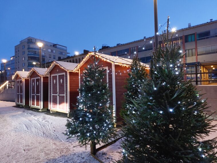 Myös torimökkien ja lavan välissä oli muutama joulupuu.