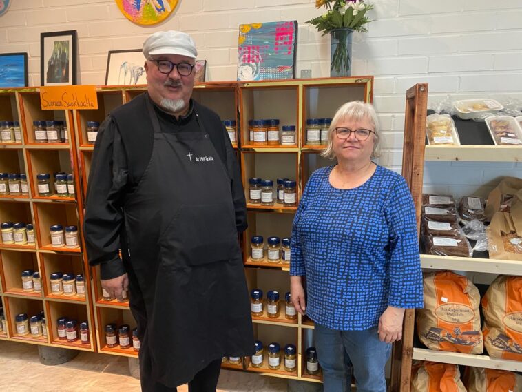 ”Minua on siunattu hyvällä vaimolla. Hanna oli pitkään kotona lasten kanssa, mitä arvostan. Hän on myös ahkera käsitöiden tekijä, ja Hannan kutomia sukkia on saatavilla myös myymälästä”, kauppias kertoo.