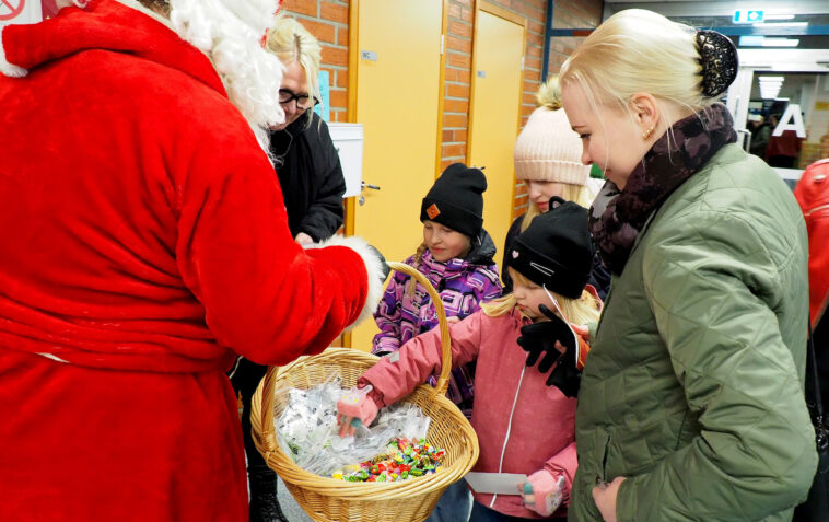 Sateinen sää ei tahtia haitannut, kun väki perjantai-iltana 28.11. marssi Sylvään koulun ovesta sisään. Joulupukki ovella tarjosi heijastinta ja namusia koristaan. Heijastin onkin nyt tarpeen, eikä namupala suussakaan tuntunut hullummalta.