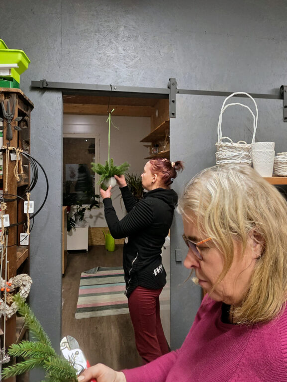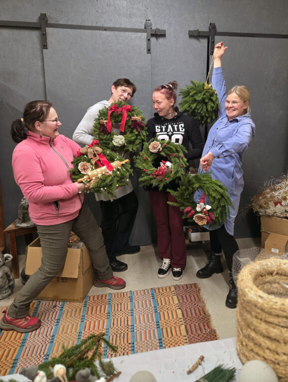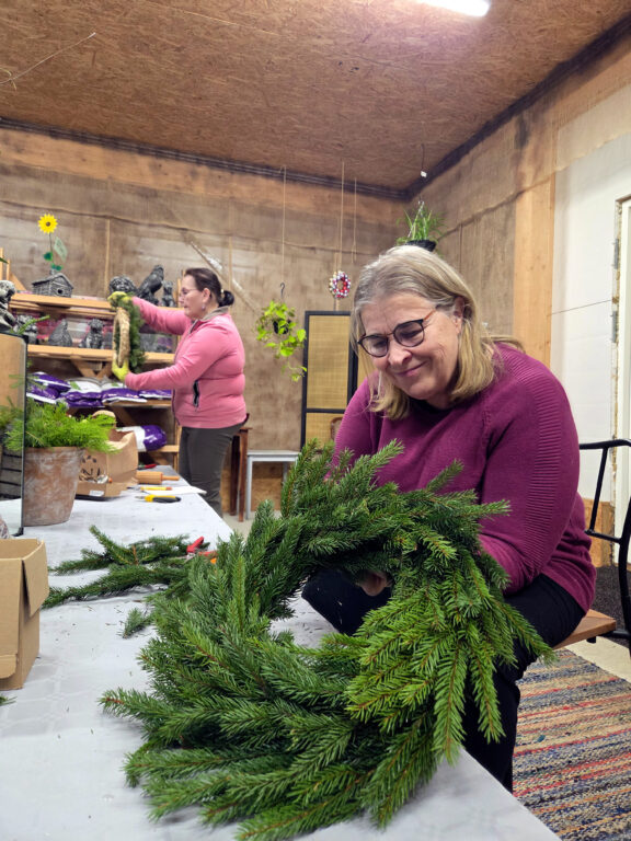 Kalliosalo kävi jakamassa tietojaan ja kokemuksiaan Piha ja Puutarha Rosalinin havukoristepajassa marraskuun lopussa. Paikalla oli muutama innokas oppija, joille kranssien teko oli ihan uutta.