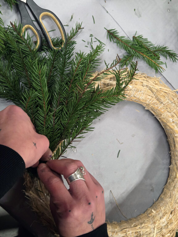 Älä säästele havujen käytössä, sillä kranssi näyttää hyvältä, kun havuja on paljon.