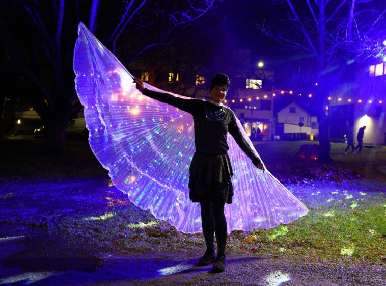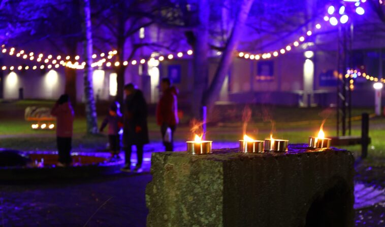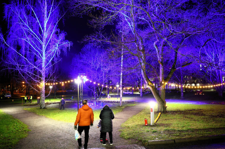 Juhlallisuudet eivät rajoittuneet pelkästään torille, vaan koko Aittalahdenpuisto oli muuttunut ihastuttavaksi valotaideteokseksi, ja kylpi siniristilipun sävyissä. Valot leikittelivät suurten puiden oksistoissa ja pitkin puistoa erilaisin liikkuvinkin efektein.