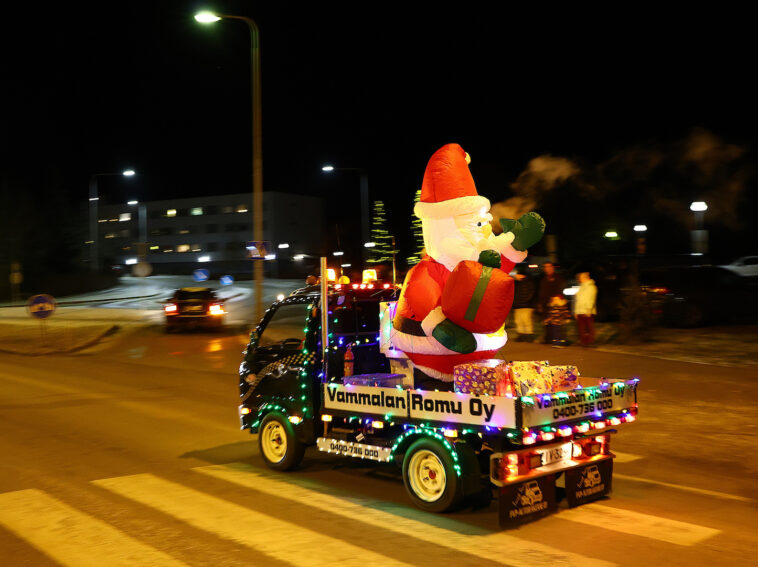Jouluinen autokulkue ylitti matkallaan myös valaistun Vammaskosken sillan kääntyen Uosson liikenneympyrästä takaisin keskustaan ja siitä Kiviniityn pihalle jatkoille. Sillalla oli paikoin hieman ahdasta, kun palaavat ja vasta Uossolle menevät isot autot kohtasivat. Hyvä joulumieli oli kuskeillakin kuitenkin päällimmäisenä mielessä ja matkustajilla hyvät, lämpimät ja hellät oltavat.