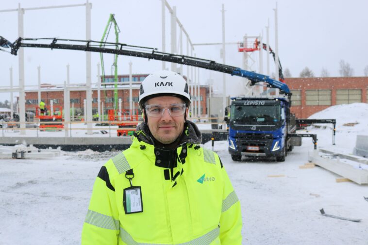 ”Piakkoin päästään asentamaan isoja elementtejä, ulkoseiniä ja kattoa. Eli rakennus alkaa todenteolla hahmottua”, Kangas sanoo.