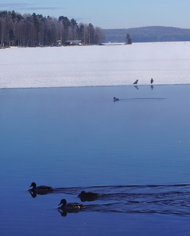 Tässä pääpiirteittäin kylmän helmikuisen sään rantalinnusto Vammalassa, sorsia, varikset ja yksinäinen telkkäkoiras.