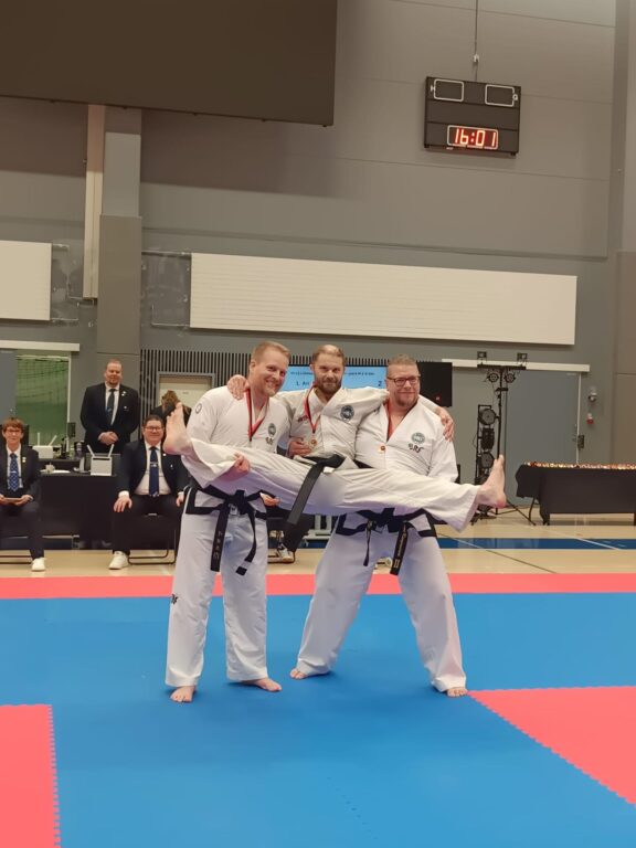 Ari Suonpää (keskellä) voitti kultaa 36+ 1-2. dan liikesarjoissa.