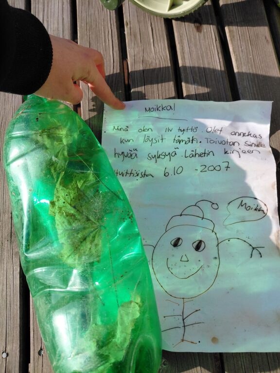 Kirjeestä paljastui hauska piirustus ja teksti, josta selvisi, että pulloposti on laitettu matkaan jostain Huittisista lokakuussa 2007.