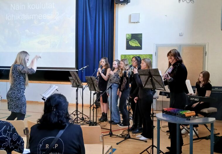 Juhlan ohjelmassa oli muun muassa oppilaiden musiikkiesityksiä. Tässä esiintymässä Jenniina Harkki, Amalia Vesaniemi, Venla Mäkiranta, Leia-Liisa Piiarainen, Amanda Rintala, Amalia Ahjo ja Senni Krapi. Opettaja Ella Vuorma ohjaa. Kuva: Mirja Torssonen.
